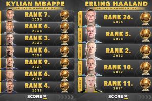 全文摘要:外媒Score90对比了姆巴佩与哈兰德的历年金球奖排名。26岁的姆巴佩和25岁的哈兰德均未获奖,但近年排名稳步上升。2023年,哈兰德第2、姆巴佩第3;2024年,哈兰德第5、姆巴佩第6。两人竞争激烈,究竟谁能率先问鼎金球奖备受关注。