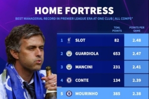 全文摘要:根据德转统计,在英超执教单一俱乐部主场场均得分榜上,斯洛特(利物浦)以场均2.48分位列第一,瓜迪奥拉(曼城)以场均2.47分紧随其后。穆里尼奥和弗格森分列第五和第六。该统计要求教练执教场次至少达25场。