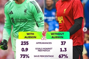 全文摘要:英超利物浦将战切尔西,主力门将阿利森伤缺,预计玛玛达什维利顶替。数据显示,阿利森缺战时,利物浦场均丢球增至1.3球,扑救成功率降至67%,虽场均积分略高,但赢球率从73%下滑至66%,防线稳定性明显减弱。