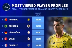 全文摘要:德国转会市场公布9月球员页面浏览量排名,C罗以超高人气位居榜首,埃德森、京多安分列二三位。尽管梅西在榜,但仅列第七,前十还包括恰基尔、登贝莱等球员。