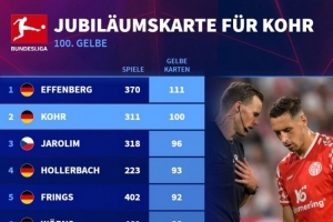 全文摘要:德国转会市场公布了德甲历史黄牌榜。老将埃芬博格以370场111张黄牌高居榜首,科霍以311场100张黄牌位列第二。榜单中还包含了弗林斯、沃恩斯等知名球员的纪录,反映了他们在激烈对抗中的纪律情况。