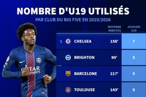 全文摘要:德国转会市场统计显示,切尔西本赛季五大联赛中使用U19球员最多,达7人,居首。巴萨、巴黎等5队并列第二,各使用5人。其中,巴黎U19球员平均出场时间最高,为304分钟。