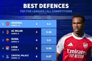 全文摘要:德国转会市场统计显示,五大联赛本赛季场均丢球最少的是阿森纳(0.3球),AC米兰以0.38球紧随其后。罗马(0.5球)、里昂(0.56球)和水晶宫(0.67球)分列三到五位,拜仁、曼城和阿斯顿维拉则以0.8球并列第八。