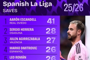全文摘要:Squawka统计显示,西甲本赛季扑救榜出炉。皇家奥维耶多门将埃斯坎德尔以41次扑救高居榜首。奥萨苏纳的塞尔吉奥-埃雷拉以28次位列第二,瓦伦西亚的阿吉雷萨巴拉以27次紧随其后。该榜单展现了各队门将的活跃扑救表现。