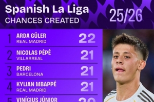 全文摘要:Squawka统计数据显示,本赛季西甲创造机会次数排行出炉。皇马新星居勒尔以22次创造机会位列榜首。紧随其后的分别是比利亚雷亚尔的尼古拉斯-佩佩与巴萨的佩德里,两人均创造21次机会,并列第二。皇马的姆巴佩同样以21次创造机会排名第四。