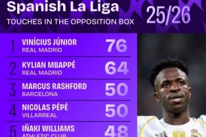 全文摘要:Squawka统计本赛季西甲禁区触球次数,皇马前锋维尼修斯以76次居首,新队友姆巴佩以64次位列第二。榜单中巴萨球员占三席,拉什福德、尼古拉斯-佩佩等紧随其后,展现了球员在进攻端的威胁区域活跃度。