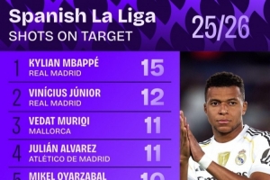 全文摘要:根据Squawka统计,姆巴佩以15次射正次数领跑西甲射手榜。维尼修斯以12次位居第二,维达特-穆里奇与阿尔瓦雷斯并列第三,均有11次。皇马球员包揽前二,巴萨有多名球员上榜,莱万以8次位列第十。