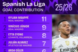 全文摘要:根据Squawka统计,西甲本赛季参与进球次数排行中,皇马前锋姆巴佩以11次参与进球高居榜首。巴萨的维尼修斯(9次)和艾永(8次)分列二、三位。该榜单展现了各队攻击手本赛季的进攻贡献。