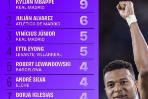 全文摘要:Squawka统计显示,本赛季西甲射手榜上,皇马的姆巴佩以9球高居榜首。马竞的阿尔瓦雷斯以6球位列第二,皇马的维尼修斯与艾永同以5球并列第三。莱万的巴萨队友费兰-托雷斯等六名球员均打入4球,并列射手榜第五位。