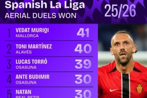 全文摘要:根据Squawka统计,本赛季西甲争顶成功次数排行出炉。马洛卡的穆里奇以41次高居榜首,阿拉维斯和奥萨苏纳的球员紧随其后。皇马中卫赫伊森以21次成功争顶位列第八。