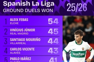 全文摘要:根据Squawka统计,西甲球员本赛季地面拼抢成功次数排行中,埃尔切球员费巴斯以54次位居榜首。皇马的维尼修斯以45次位列第二,其队友姆巴佩则以40次排名第七。