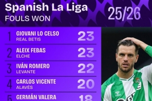 全文摘要:Squawka统计显示,本赛季西甲被犯规次数排行榜出炉。贝蒂斯球员洛塞尔索以23次被犯规次数高居榜首。埃尔切球员费巴斯同样被犯规23次,并列第一。马竞小将朱利亚诺-西蒙尼则以18次被犯规次数,与多名球员并列第五位。