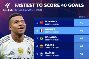 全文摘要:德国转会市场列出1990年后最快达西甲40球榜:C罗41场居首,姆巴佩42场第二。罗纳尔多、法尔考以48场并列第三,苏亚雷斯50场第四,贝贝托58场第五,范尼、斯托伊奇科夫、莱万同列65场第六,内马尔68场第七。