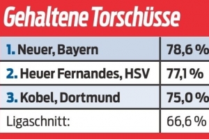 全文摘要:《体育图片报》统计了本赛季德甲门将扑救成功率,拜仁老将诺伊尔以78.6%高居榜首,汉堡的霍伊尔-费尔南德斯(77.1%)和多特的科贝尔(75%)分列二、三位。这一数据远超德甲门将平均成功率66.6%,展现了顶级门将在关键比赛中的出色表现。