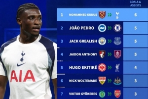 全文摘要:根据德国转会市场数据,英超新援库杜斯(热刺)以参与6球(进球+助攻)领跑新援进球榜。若昂-佩德罗(切尔西)、格拉利什(埃弗顿)等四人以5球并列第二,埃基蒂克(利物浦)参与4球位列第三。