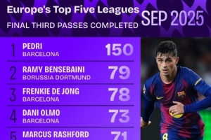 全文摘要:巴萨9月战绩出色,中场佩德里表现抢眼。他被誉为“哈维与伊涅斯塔结合体”,据Squawka统计,他以150次成功传球位居五大联赛进攻三区榜首,优势明显,远超第二名的79次。