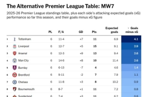 全文摘要:曼联本赛季英超实际进球(7球)远低于预期(12.3球),差距为联赛最大。尽管射门次数多,但多为低质量的禁区外射门,加上前锋姆伯莫和库尼亚状态低迷、B费失点以及多次中框,导致进攻效率低下,暴露了在进攻三区缺乏信心的问题。