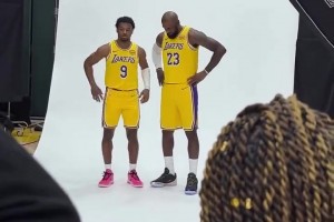 湖人媒体日 八村塁拿着手机偷拍詹姆斯和布朗尼父子的定妆照~