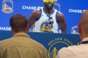 追梦格林在媒体日上整活 带着一个“boom”大眼镜接受采访~