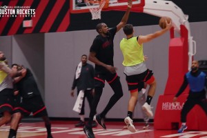 谢泼德在训练中迎着KD长臂勾手打进,这球应该看不到框了吧