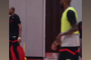 谢泼德在训练中迎着KD长臂勾手打进,这球应该看不到框了吧