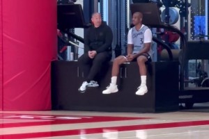 1、快船训练结束后,保罗在场边与泰伦-卢聊啥呢?