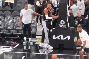 太轻松了吧,文班赛前表演胯下换手风车