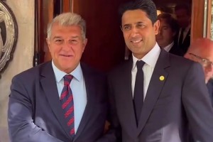 友好巴黎主席纳赛尔与巴萨主席拉波尔塔赛前聚餐